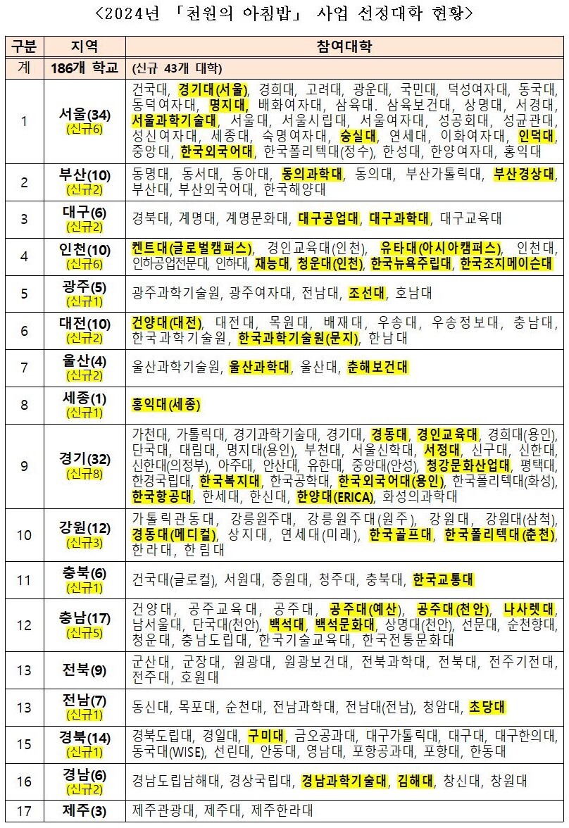 농림축산식품부는 올해 ‘천원의 아침밥’ 사업에는 전국 186개 대학이 함께 한다고 25일 밝혔다.