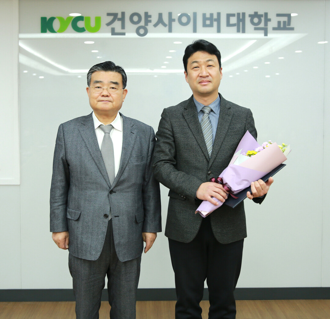 | 이동진(왼쪽) 건양사이버대 총장과 이수현 산학협력단장이 중소벤처기업부 장관상을 받은 후 기념촬영하고 있다. 사진=건양사이버대 제공 |