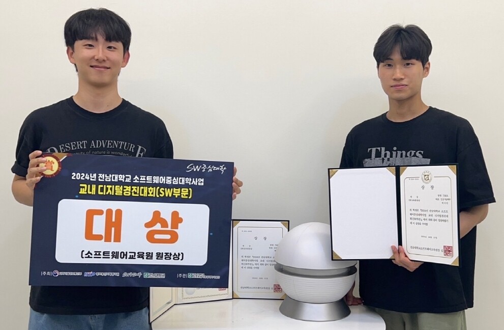 백인우, 박지민 학생이 교내경진대회서 대상을 수상하고 기념촬영을 하고 있다. 사진=전남대 제공 |