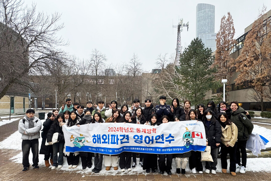 경상국립대는 동계방학을 맞이하여 캐나다 토론토메트로폴리탄대학에서 ‘동계방학 해외 파견 영어연수’를 시행한다. 연수생들이 토론토메트로폴리탄대학에서 기념촬영을 하고 있다. 사진=경상국립대 제공 |