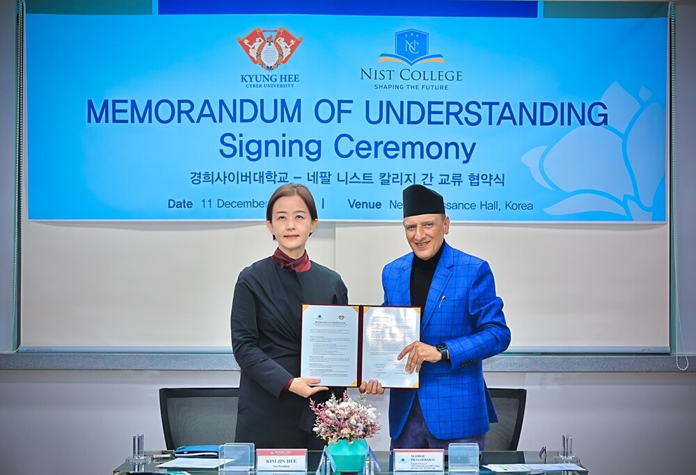 [대학저널 온종림 기자] 경희사이버대학교가 지난 11일 네오르네상스관에서 네팔 트리부반 국립대학교 니스트 칼리지(NIST, 이사장 마하브 프랫사 바랄)와 국제 교류를 위한 양교 교류 협약식을 진행했다.