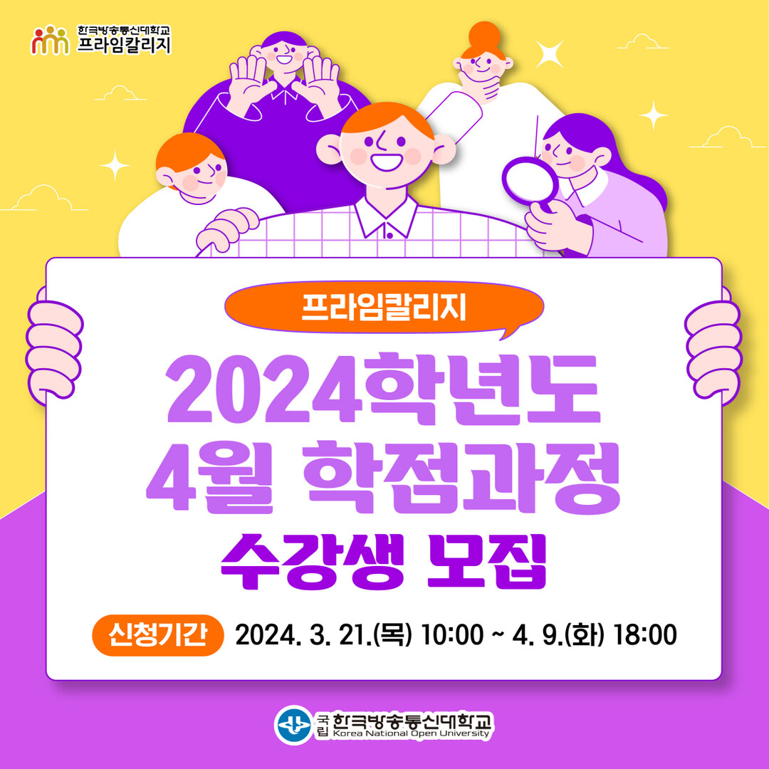 프라임칼리지 2024학년도 4월 학점과정은 학력에 관계없이 누구나 신청할 수 있다. 방송대 및 프라임칼리지 학부생의 경우 교과목 이수 시 방송대생은 12학점, 프라임칼리지생은 9학점까지 졸업 학점으로 인정받을 수 있다. 수강생 모집은 3월 21일부터 4월 9일까지, 수업은 2024년 4월 23일부터 6월 21일까지 진행된다.
