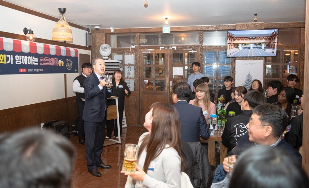 [대학저널 온종림 기자] 전북대학교 양오봉 총장이 27일 학생들과 맥주잔을 부딪히며 격의 없는 대화를 나누는 ‘호프데이’ 행사를 마련하고, 학생 자치회 임원 학생들을 초대했다.