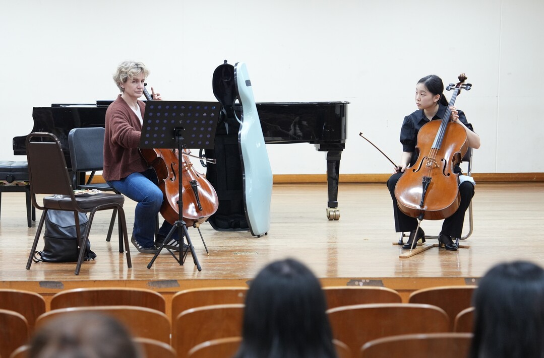 빈 필하모닉 역사상 최초 여성 콰르텟인 ‘다스 콰르텟’과 함께하는 마스터클래스 현장. 첼리스트 우르술라 벡스(Ursula Wex)가 참여 학생의 연주를 세심하게 지도하고 있다. 사진=성신여대 제공 |
