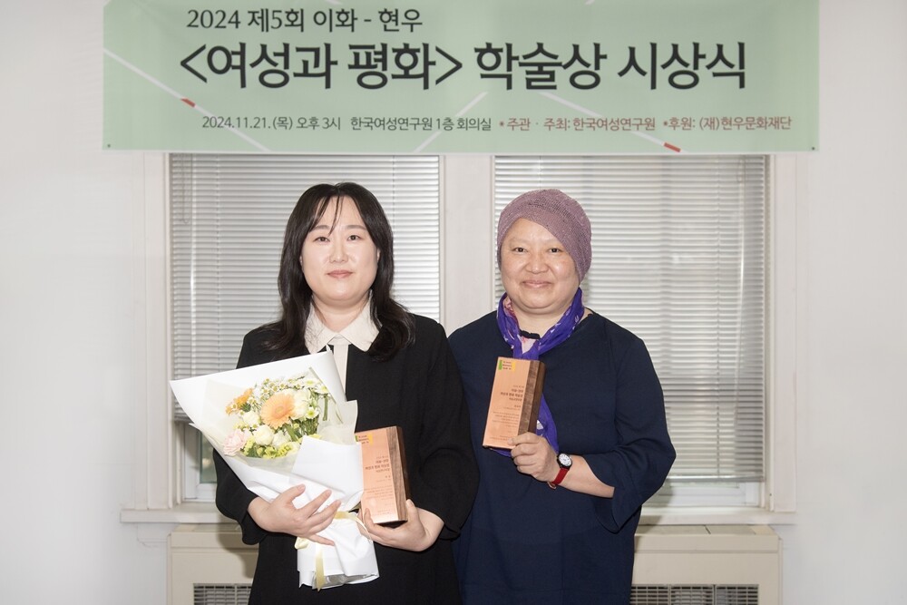 왼쪽부터 제5회 이화-현우 여성과 평화 학술상 수상자 허윤, 정희진 저자. 사진=이화여대 제공 |