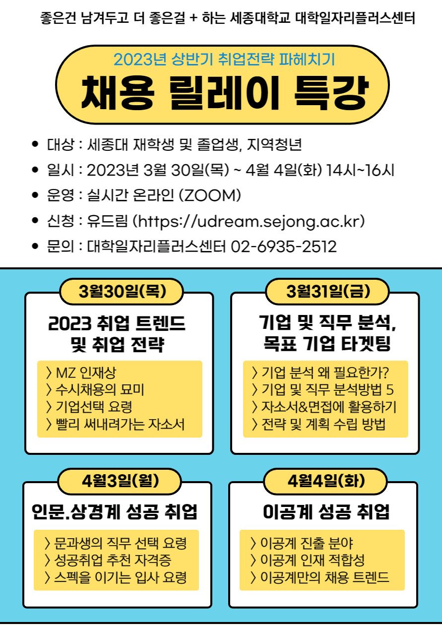 [대학저널 온종림 기자] 세종대학교는 대학일자리플러스센터가 2023학년도 상반기 채용 및 취업 전략 수립을 위한 ‘채용 릴레이 특강’을 한다고 30일 밝혔다.