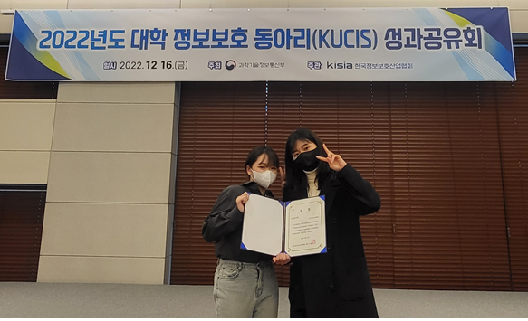 서울여대 소학회 SWING 회원들이 2022년도 대학 정보보호 동아리 연합회(KUCIS) 지원 사업에서 우수 동아리에 선정돼 상을 받은 후 기념촬영하고 있다. 사진=서울여대 제공