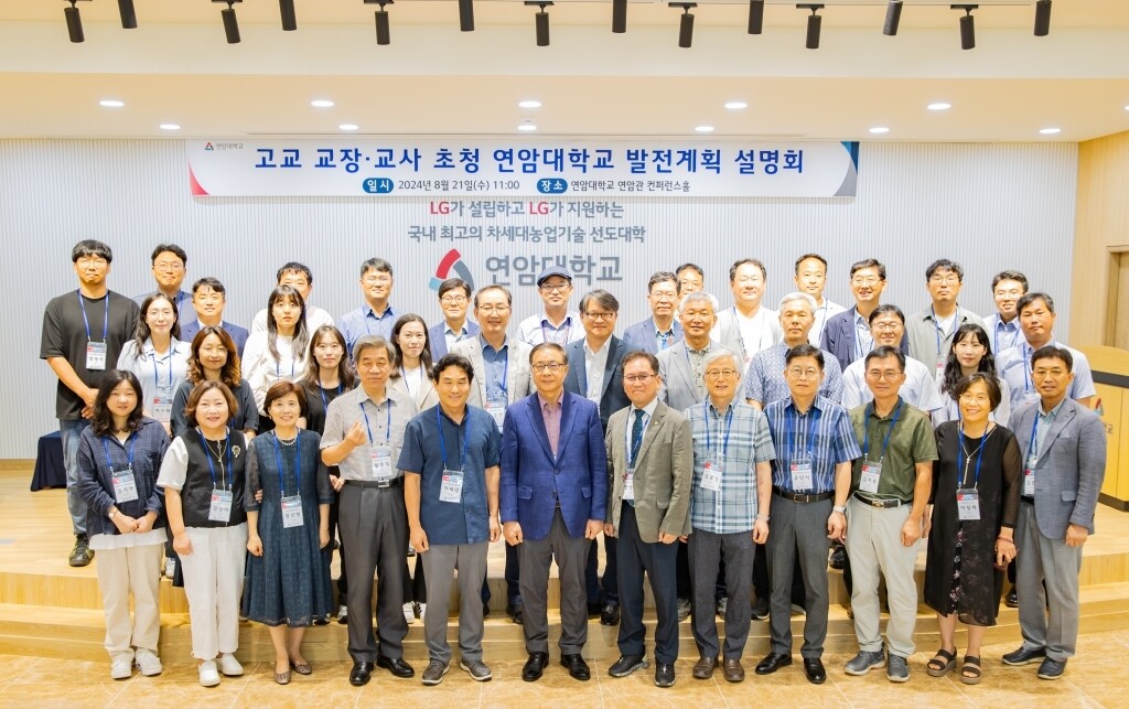 연암대가 21일 전국 15개 특성화 고교 교장 및 교사를 초청, 농업계 교육 발전 방향과 연계한 연암대의 미래 계획을 공유했다. 앞줄 왼쪽에서 6번째가 육근열 총장. 사진=연암대 제공 |