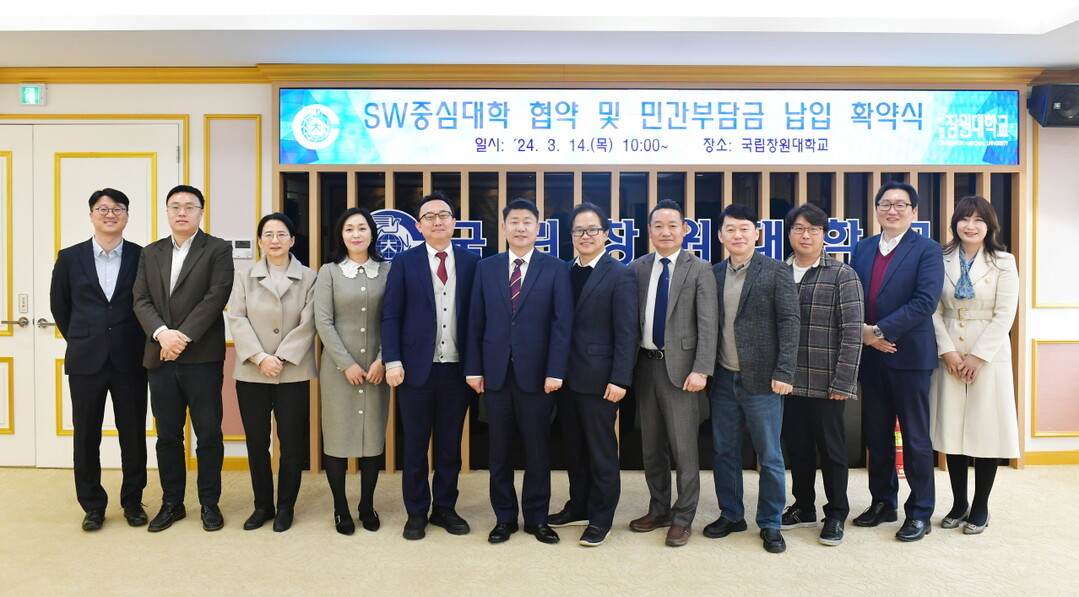 국립창원대는 14일 대학본부에서 소프트웨어 기업인 ‘하이브레인넷’, ‘아이웍스’, ‘제넥스’, ‘메타아이스퀘어’, ‘메타뷰’와 SW중심대학 협약 및 민간부담금 납입 확약식을 개최했다고 밝혔다.