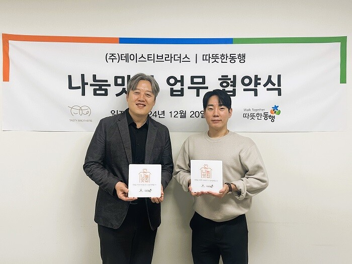 사회복지법인 따뜻한동행(이사장 김종훈)은 외식 프랜차이즈 경영 컨설팅 및 식품 제조업 전문기업 ㈜테이스티브라더스(대표 주원형)와 ‘나눔맛집’ 캠페인 업무협약을 체결했다고 23일 밝혔다.
