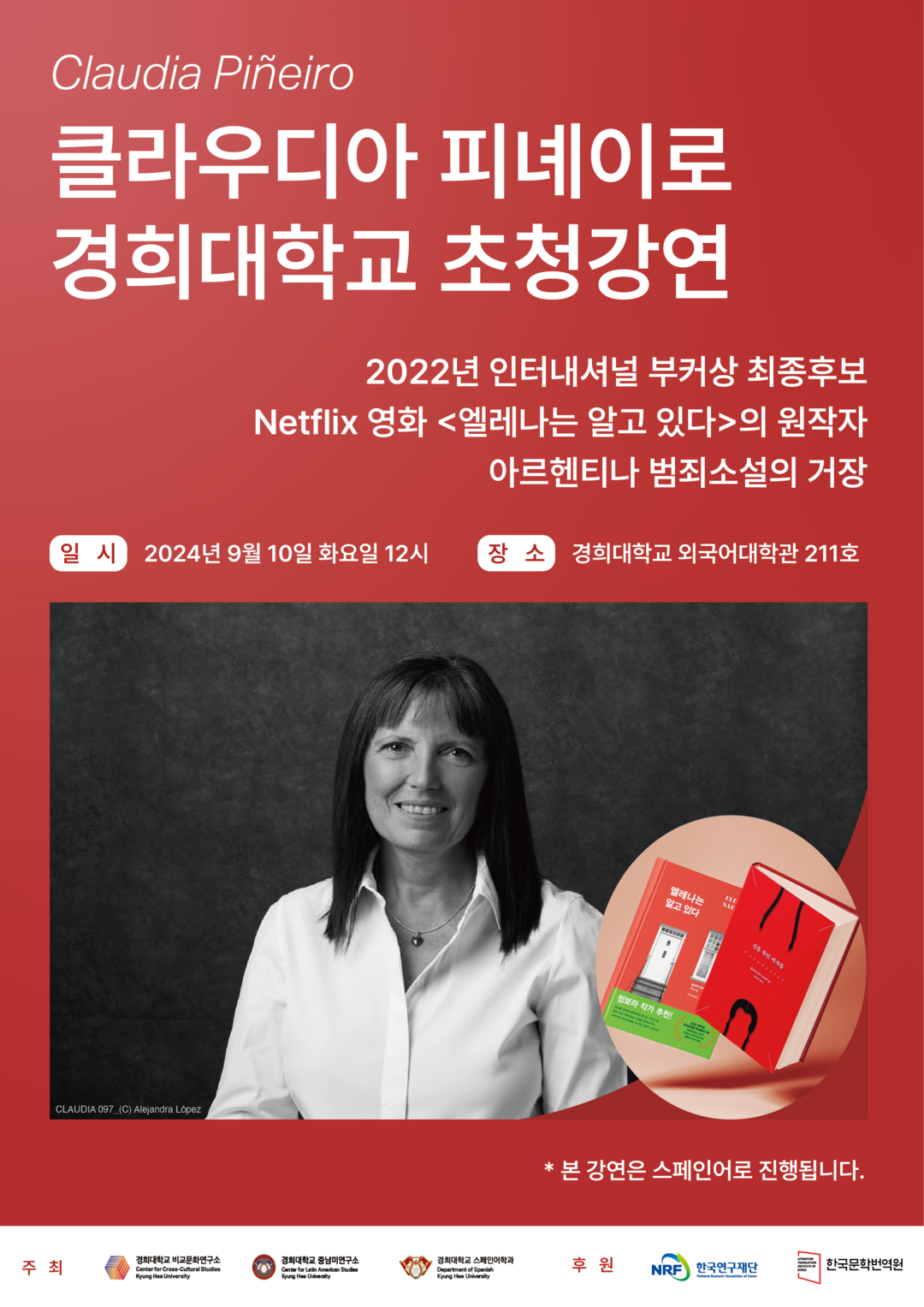 초청강연은 10일경희대 국제캠퍼스 외국어대학관 211호에서 12시부터 한 시간 동안 진행된다. 클라우디아 피녜이로는 ‘작가 등단 계기 및 글을 쓰는 이유’, ‘자신의 작품 세계의 이야기’, ‘세계적인 베스트셀러 <엘레나는 알고있다>와 관련된 궁금증’을 주제로 강연에 나선다. 클라우디아 피녜이로는 한국번역문학원이 개최하는 ‘서울국제작가축제’ 참석을 계기로 방한했고, 한국의 젊은이들을 만나 작품 세계에 관해 이야기를 나누고, 한국 독자의 목소리를 듣기 위해 경희대 비교문화연구소를 찾게 됐다.
