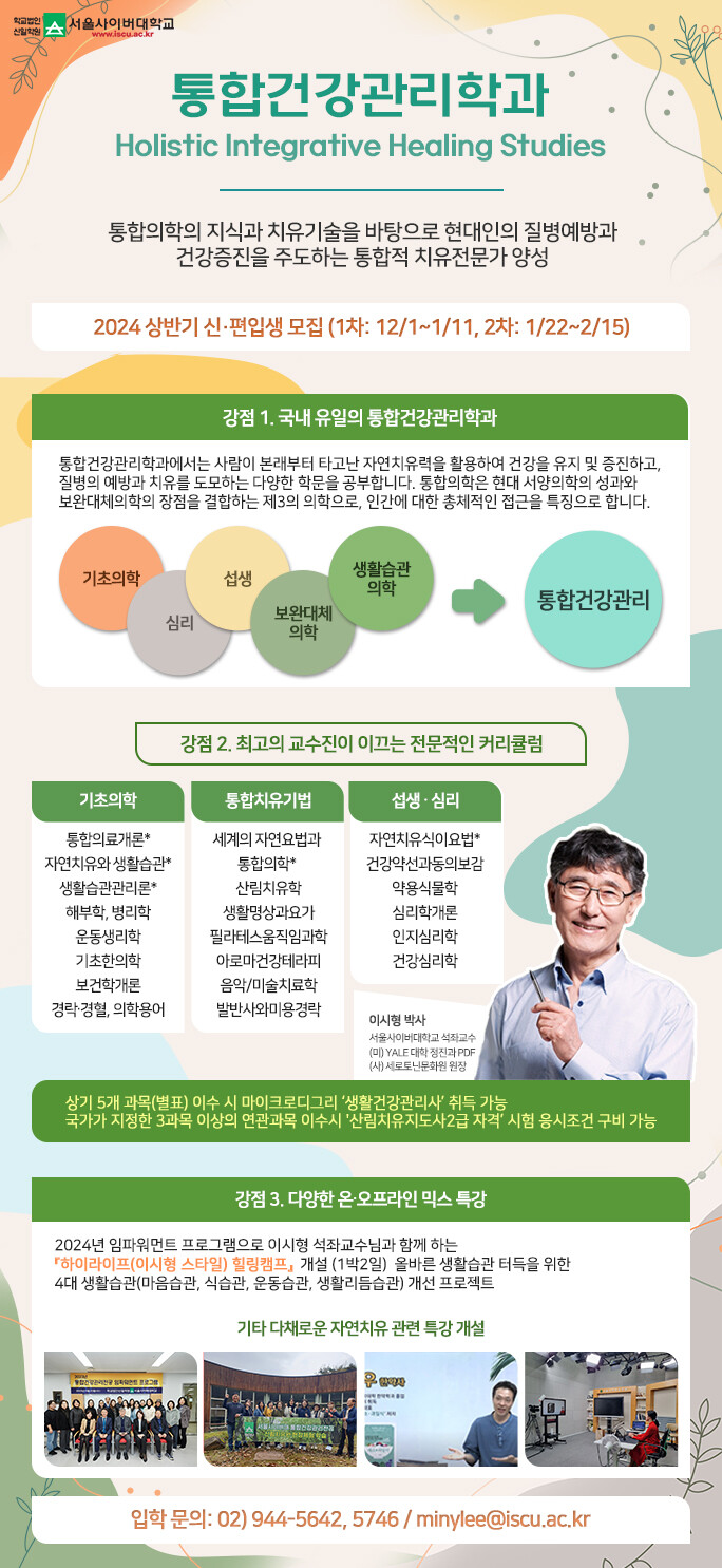 통합의학은 현대 서양의학의 성과와 보완대체의학의 장점을 결합하는 의학으로, 통합의학의 관점을 바탕으로 자연치유 이론과 기법을 익히는 실무역량 교육을 통한 통합적 치유 전문가 양성을 목적으로 한다.