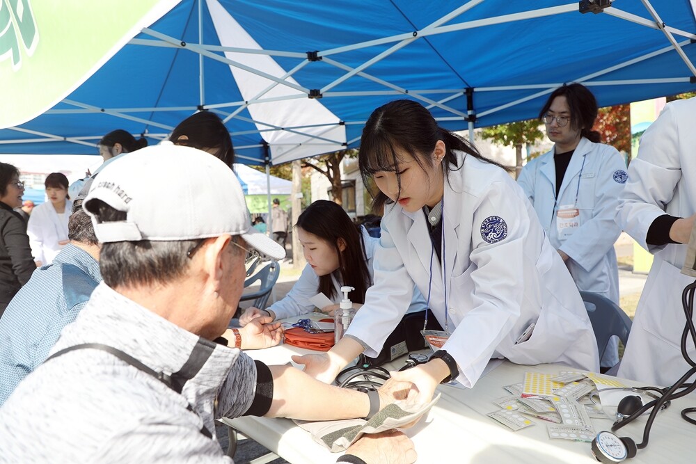이날 간호학과는 혈당 및 혈압 체크, 치매, 우울 검사 등을, 물리치료과는 건강마사지 체험을, 치위생과는 구강 세균 검사, 구강 및 틀니 관리 안내 등의 프로그램을 진행해 지역민에게 학과 특성을 살린 주민 건강 돌봄 봉사 프로그램을 제공했다.