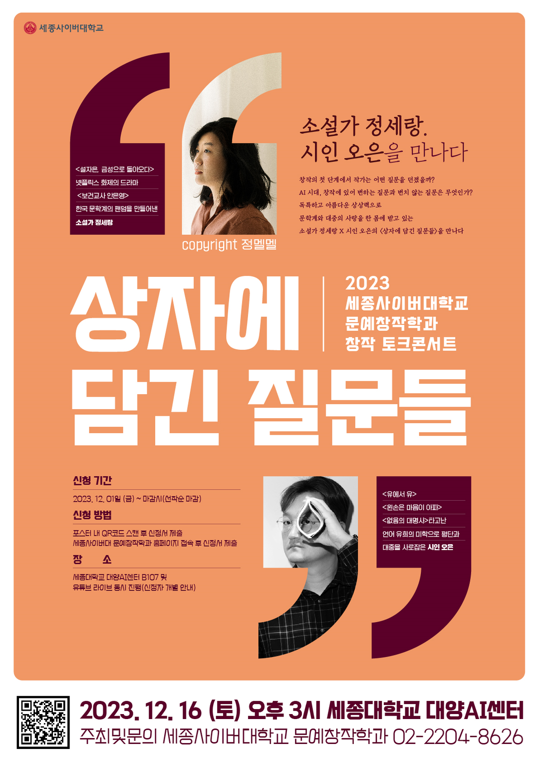 한편, 소설가 정세랑, 시인 오은의 ‘상자에 담긴 질문들’ 창작토크콘서트는 오는 12월 16일 오후 3시부터 세종대 대양AI센터에서 진행되며 세종사이버대 재학생과 입시지원자뿐 아니라 글쓰기를 사랑하고 배우려는 사람이라면 누구나 참가가 가능하다. 창작토크콘서트 공식포스터 QR코드나 ‘세종사이버대 문예창작학과’ 홈페이지를 통한 신청서 접수로 가능하며 신청자를 대상으로 행사 장소와 유튜브 링크를 개별 발송한다.