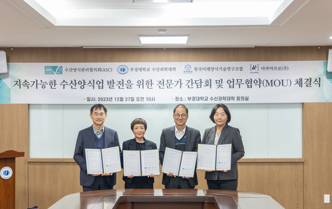 국립부경대 수산과학대학과는 ASC(Aquaculture Stewardship Council·수산양식관리협의회), 한국미래양식기술연구조합, 아쿠아프로㈜와 27일 학내 수산과학대학 회의실에서 ‘지속가능한 수산양식기술 확산’을 위한 다자간 협약식을 가졌다.