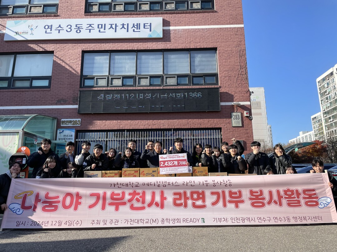 이번 라면기부는 가천대 메디컬캠퍼스 재학생 및 교직원 40여 명이 함께 마음을 모았으며, 전달된 라면은 연수3동 행정복지센터가 인천사회복지공동모금회를 통해 저소득층에 전달할 예정이다.