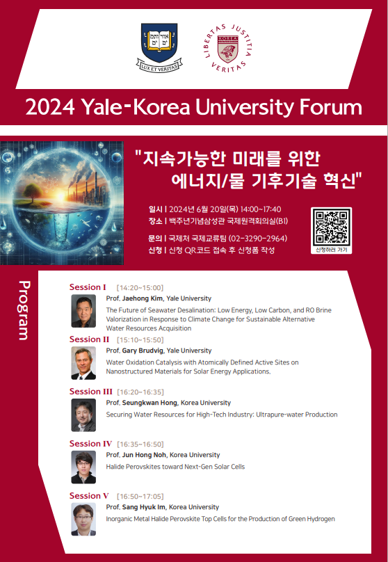 예일대 Jaehong Kim 교수의 ‘해수 담수화의 미래’에 대한 발표를 시작으로 예일대 Gary Brudvig 교수와 고려대 홍승관 교수, 노준홍 교수, 임상혁 교수의 발표가 이어질 예정이다.