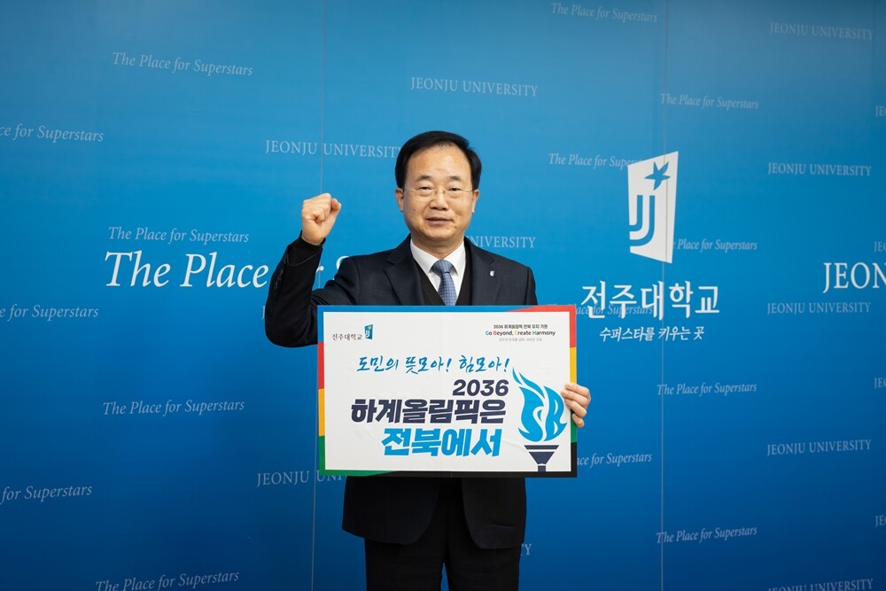 전주대 박진배 총장이 '2036 하계올림픽 전북 유치'를 기원하는 'GBCH 응원 릴레이 챌린지'에 동참했다. 사진=전주대 제공 |