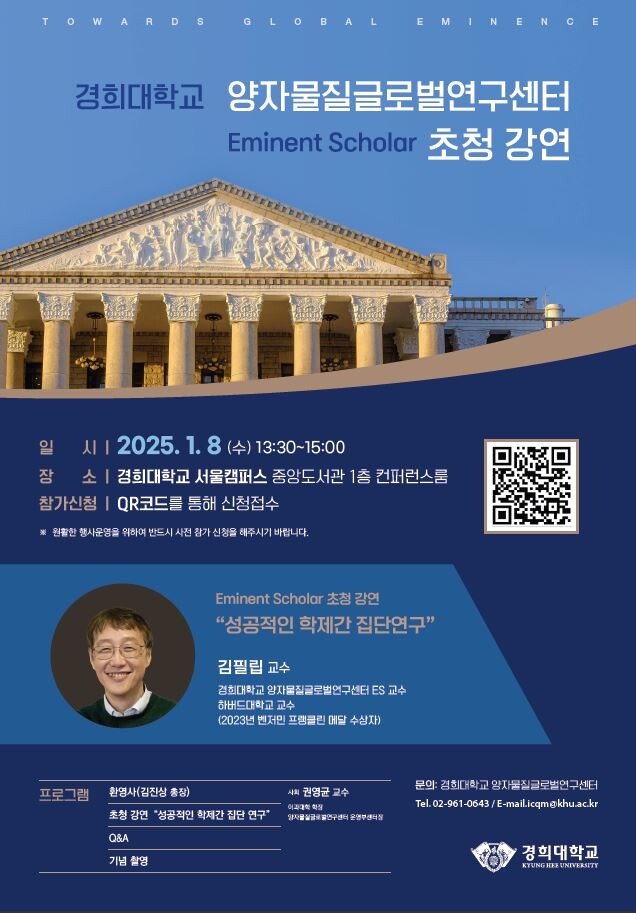 강연을 준비한 경희대 양자물질글로벌연구센터는 “세계적 석학인 김필립 교수를 초빙해 연구 노하우를 들을 기회”라며 “이번 강연이 학제간 융합 연구의 중요성과 성공적인 연구 협력의 방향성을 모색하는 데 큰 도움이 되길 기대한다”고 밝혔다.