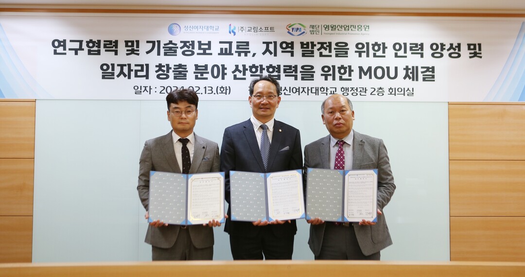 [대학저널 이선용 기자] 성신여자대학교 연구산학협력단이 지난 13일 돈암동 수정캠퍼스에서 정보기술(IT), 디지털전환(DT) 분야 인력양성을 위해 영월산업진흥원과 국내 IT융합기술 기업 ㈜교림소프트 간 3자 업무협약을 체결했다.
