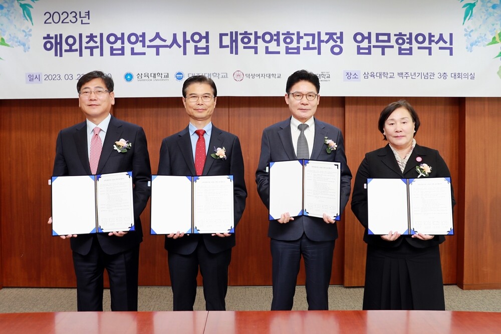 삼육대는 전날 이 대학 백주년기념관 대회의실에서 대진대, 덕성여대, 서경대와 ‘2023년 해외취업연수사업 대학연합과정 업무협약(MOU)’을 체결했다.