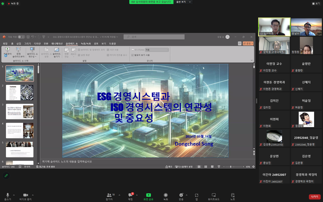 이번 특강에서는 현장에서 다년간 ESG컨설팅 및 평가위원으로 활동하고 있는 송동철 한국준법진흥원 심사위원을 초청해 ‘ESG와 ISO의 연관성’, ‘ESG 전략 수립’, ‘ESG 투자와 기업가치’, ‘ESG 경영의 미래 전망’ 등의 내용으로 강연을 듣는 시간을 가졌다.