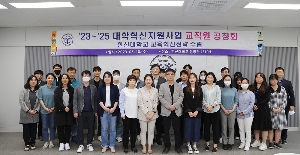 한신대 교직원들이 지난 10일 ‘2023~2025 대학혁신지원사업 교직원 공청회’를 한 후 기념촬영하고 있다. 사진=한신대 제공
