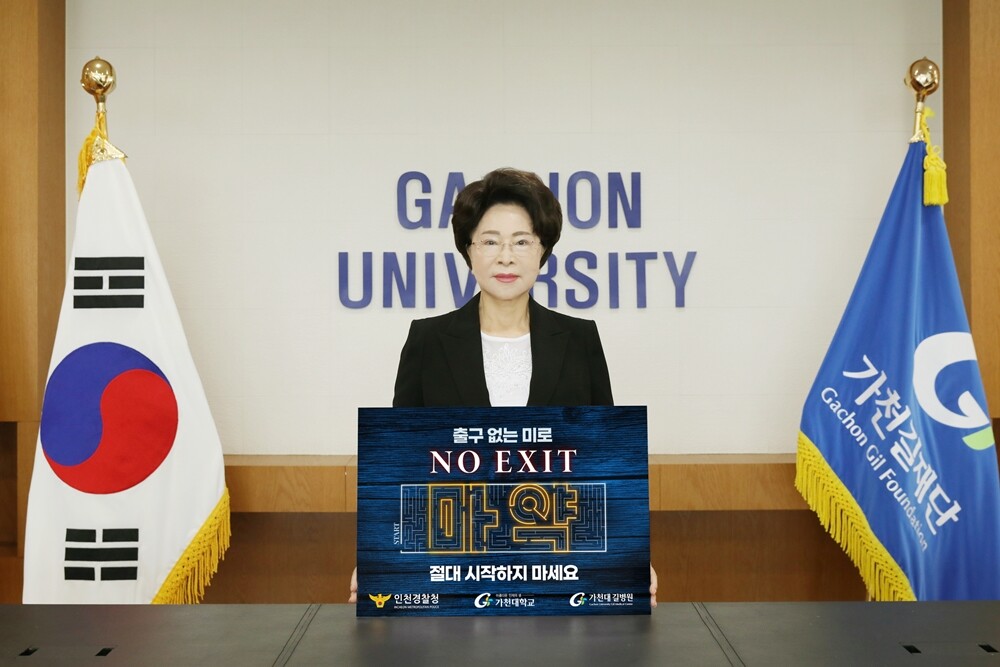 [대학저널 온종림 기자] 이길여 가천대학교 총장이 15일 마약의 위험성을 알리고 경각심을 고취해 마약 범죄를 예방하는 ‘노 엑시트’(NO EXIT) 캠페인에 동참했다.