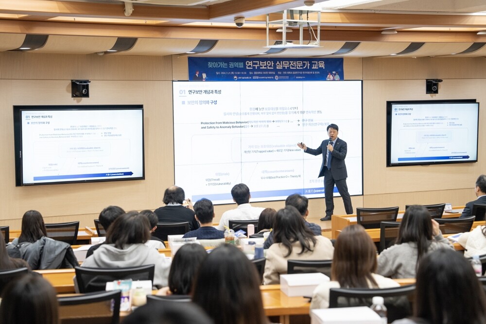 이날 교육에서는 다양한 연구보안 분야 주제가 다뤄졌다. ▲연구보안 제도와 동향 분석 ▲국가연구개발사업 수행단계별 보안관리 방안 ▲연구환경 보안관리와 정책방향 ▲국내외 연구보안 사례 ▲연구보안 관리체계 ▲연구개발 산출물 보호 ▲정보통신 보안관리 등에 대한 상세한 강연이 진행됐다. 이론적 지식에만 그치지 않고 연구 현장에서의 실질적 사례를 소개하며 실무 적용 방안이 중요하다는 점을 강조하기도 했다.