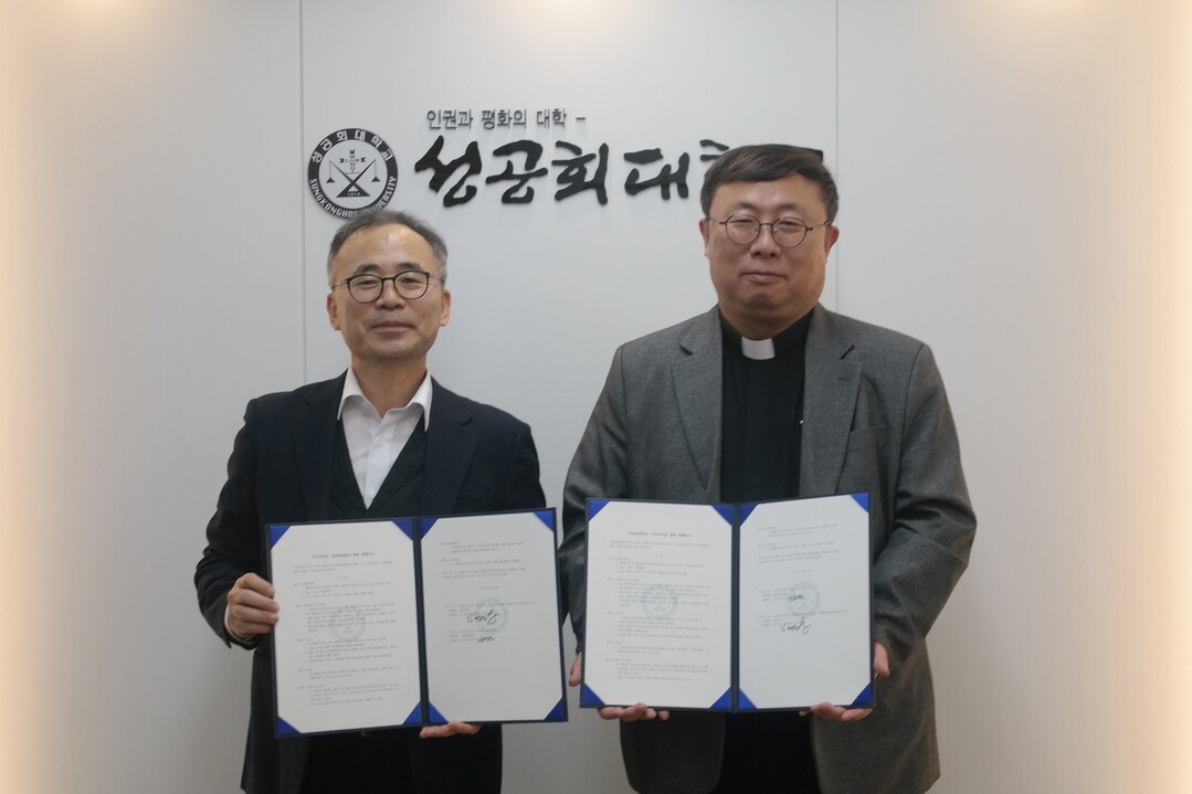 임재환(왼쪽) 유비온 대표이사와 김경문 성공회대 총장이 업무협약을 체결하고 기념 촬영을 하고 있다. 사진=성공회대 제공