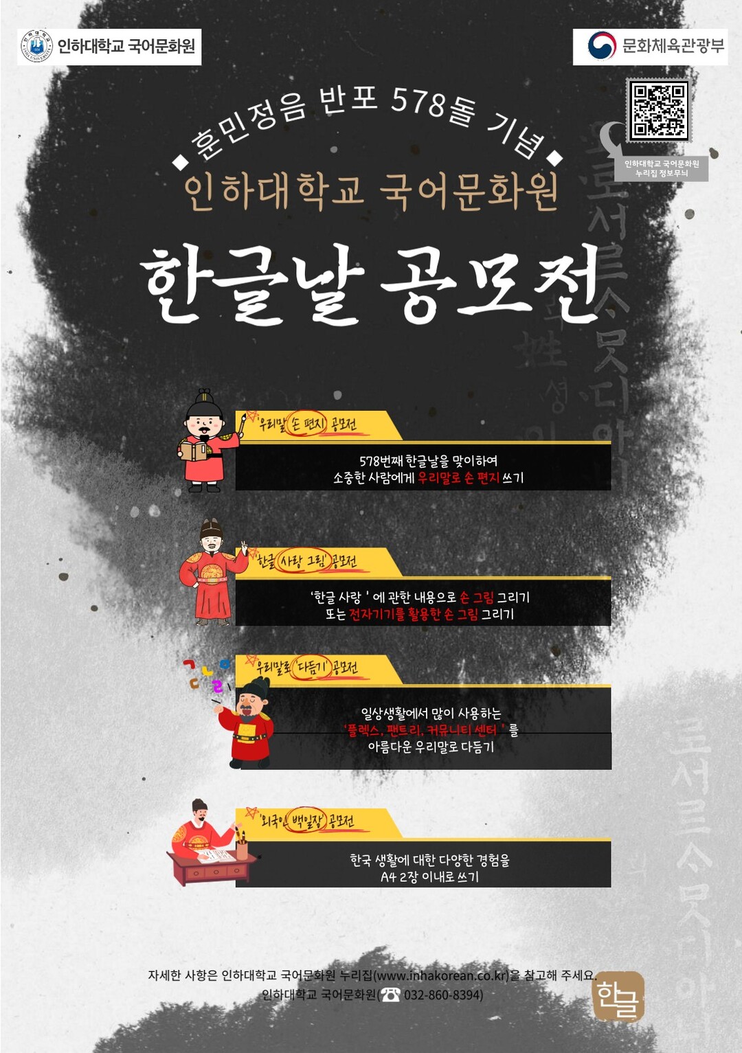 인하대 국어문화원은 한글의 우수성을 알리고 한글에 대한 관심과 사랑을 드높이기 위해 우리말 손 편지, 그림, 외국인 백일장, 우리말로 다듬기 등 한글 사랑 공모전을 매년 개최하고 있다.