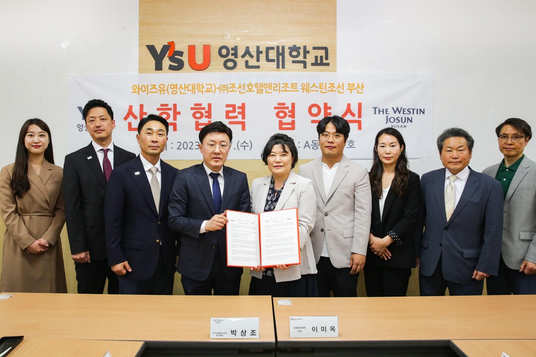 | 영산대학교와 조선호텔리조트 웨스틴조선부산 관계자들이 업무협약을 체결한 후 기념찰영하고 있다 있다. 사진=영산대 제공 |