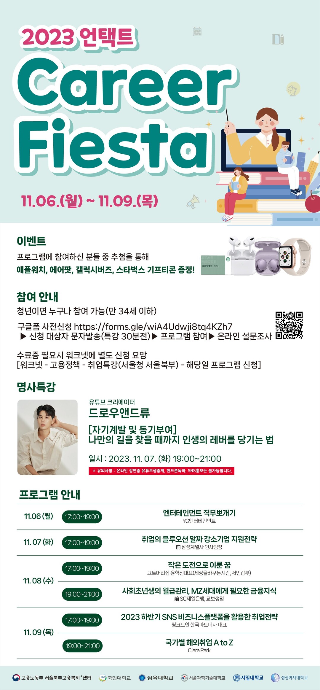 이번 박람회는 삼육대, 국민대, 서울과기대, 성신여대, 서일대 재학생 및 졸업생과 지역 청년이면 누구나 참여할 수 있다. 포스터에 안내된 구글폼 링크 혹은 QR코드를 통해 사전 신청하면 된다.
