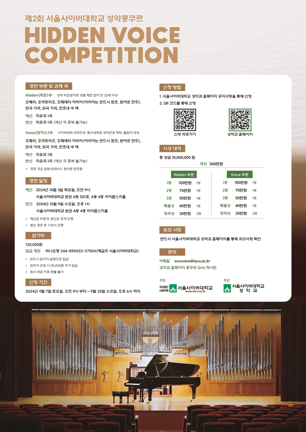 이번에 개최되는 제2회 서울사이버대 성악콩쿠르 'HIDDEN VOICE COMPETITION'는 서울사이버대 주최로, 국내 최대 규모의 총 상금 1,000만 원으로 대상을 비롯한 다수의 상이 주어질 예정이다.