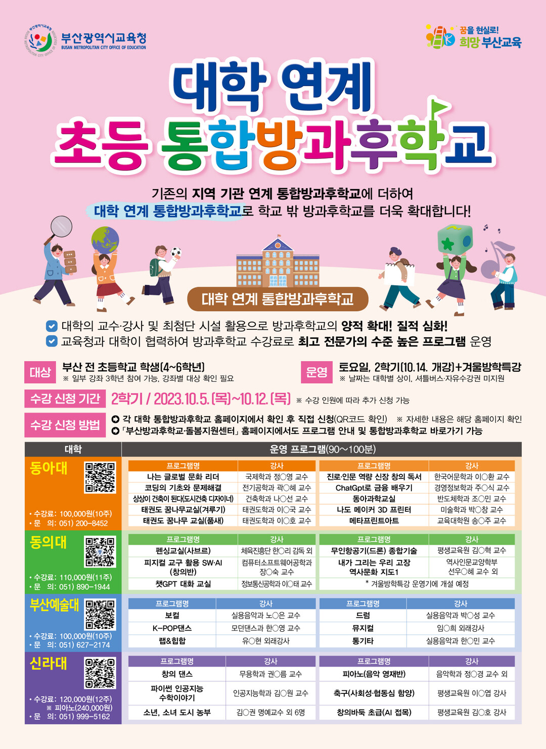수강신청 기간은 12일까지이며 각 대학 통합방과후학교 홈페이지에서 확인 후 직접 신청하거나 부산방과후학교·돌봄지원센터 홈페이지를 참조해도 된다.