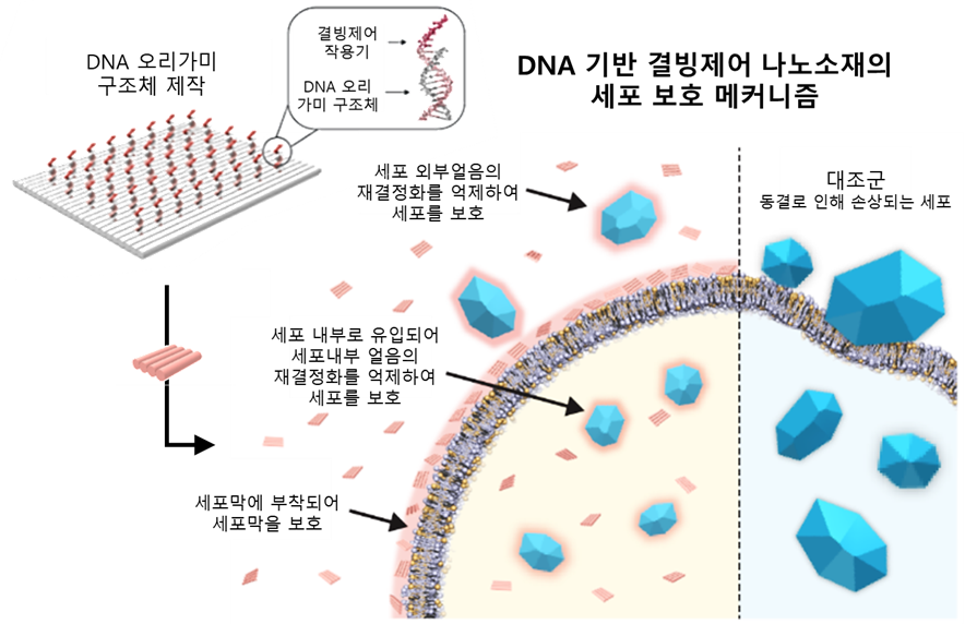 연구팀은 DNA 나노기술로 제작한 오리가미(Origami) 구조체에 결빙제어 성능이 있는 단백질 시퀀스를 결합 및 배열해 세포독성이 없으면서 1/3500의 극미량 농도에서도 기존의 화학적 동결보존제(DMSO)보다 약 50% 높은 세포복원율을 보이는 동결보존 소재를 개발했다.