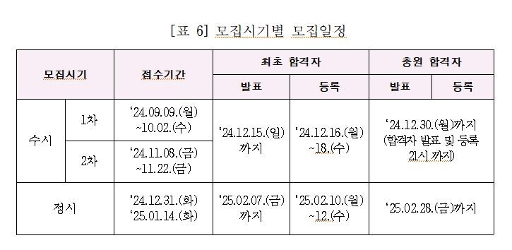 수시 1차는 2024년 9월, 2차는 같은해 11월에 실시되며, 정시는 12월 말에 시작된다.