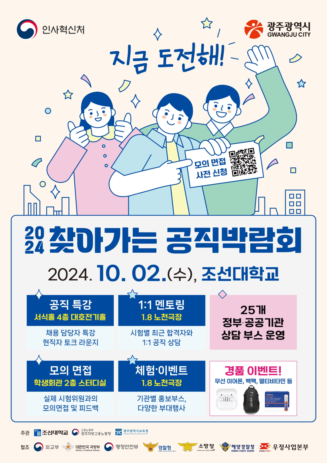 김춘성 조선대 총장은 “이번 박람회를 통해 조선대 학생들과 광주·전남의 청년들이 공직에 더욱 많은 관심을 가지기를 바란다”며 “막연히 공무원이라는 꿈보다는 다양한 기관에서 어떤 일을 하는지 이해하고 공직을 포함한 여러 공공기관 현직자와의 만남을 통해 전략적인 취업 준비를 할 수 있기를 기대한다”고 말했다.