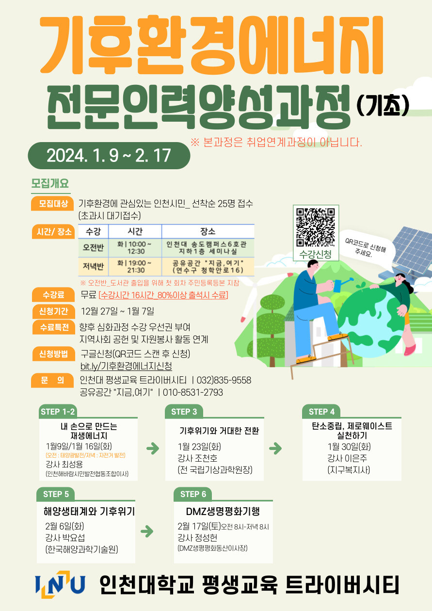 교육 기간은 1월 9일부터 2월 17일까지 매주 화요일 총 16시간이다. 오전반(10:00~12:30/인천대 송도캠퍼스)과 저녁반(19:00~21:30/공유공간 ‘지금여기’) 2개 반으로 운영하며 각 반별 모집 정원은 25명이다.