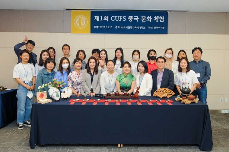 사이버한국외국어대 교수와 학생들이 중국의 다도문화를 주제로 열린 ‘제1회 CUFS 중국 문화 체험’ 행사가 끝난 후 기념촬영을 하고 있다. 사진=사이버한국외대 제공 |