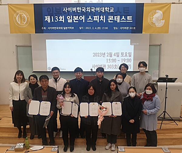 사이버한국외국어대 일본어학부가 지난 4일 연 ‘제13회 일본어 스피치 콘테스트’ 수상자들이 기념촬영하고 있다. 사진=사이버한국외국어대