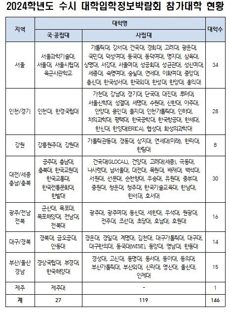 이번 대교협 수시 대입정보박람회에는 서울대와 연세대, 전북대 등 전국 146개대가 참가한다(하단 표 참조).