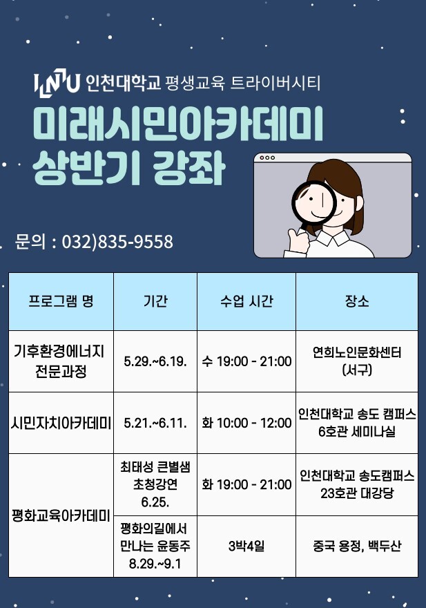 기후위기에 대응하는 탄소중립과 자원순환, 재생에너지 전환 내용을 담은 ▲‘기후환경에너지 전문과정’(서구편)이 29일~6월 19일, 지방시대 실질적 실현을 위한 시민자치력 강화를 교육적 목표로 하는 ▲‘시민자치아카데미’가 21일~6월11일까지 총 4회 실전맞춤형으로 진행된다. 군사적 긴장과 우발적 충돌 위기가 상존하는 접경지역 인천의 지정학적 특수성으로 인해 평화공감대 확산과 소통을 위해 마련된 ▲‘평화교육아카데미’는 “최태성 큰★별쌤 초청강연(6월 25일)”과 작년 안중근을 찾아떠나는 평화순례지로 중국 여순, 단동을 다녀온 데 이어 올해는 ‘평화의 길에서 만나는 윤동주(8월 29일~9월 1일)’를 테마로 용정 윤동주 생가와, 백두산 현장탐방을 계획하고 있다.