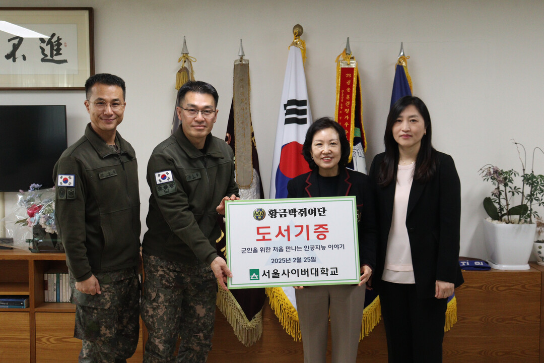 이번 도서기증식 및 AI 특강은 경기도 고양시에 위치한 육군 제9보병사단 황금박쥐여단에서 진행되었으며 서울사이버대 측에서는 이정원 부총장, 이수란 처장, 천지영 교수, 군교육지원처 관계자들이 참석했다.