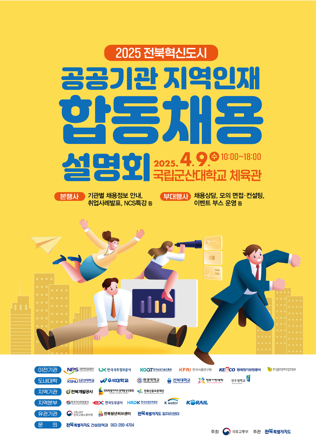 올해 합동채용설명회에는 국민연금공단, 한국국토정보공사, 한국전기안전공사, 한국식품연구원, 한국출판문화산업진흥원, 한국농업기술진흥원 등 혁신도시 이전 공공기관 6곳과 한국가스안전공사, 한국도로공사, 한국수자원공사 등 지역기관·본부 8곳, 전북도내 6개 대학, 유관기관 3곳이 참여한다.