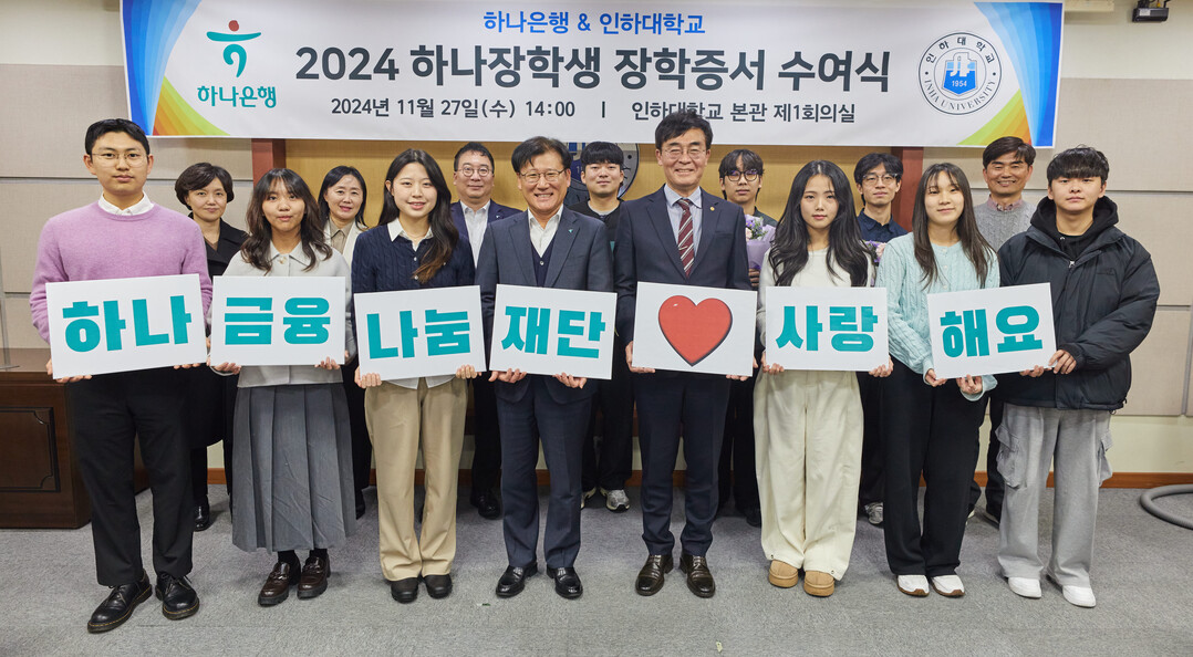 [대학저널 이선용 기자] 인하대학교는 지난 11월 27일 하나금융나눔재단과 2024학년도 하나장학생 장학증서 수여식을 진행했다고 28일 밝혔다.