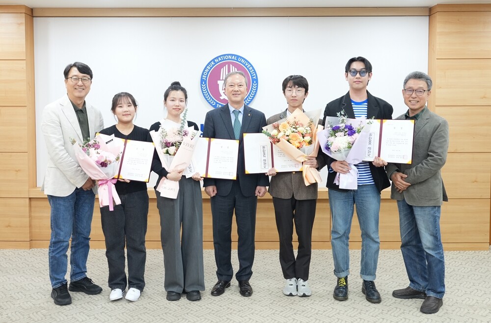 왼쪽부터 최용준 전북대 신문방송사 주간, 김소이 학생, 조하영 학생, 양오봉 전북대 총장, 문시우 학생, 김원호 학생, 복효근 심사 위원장. 사진=전북대 제공 |