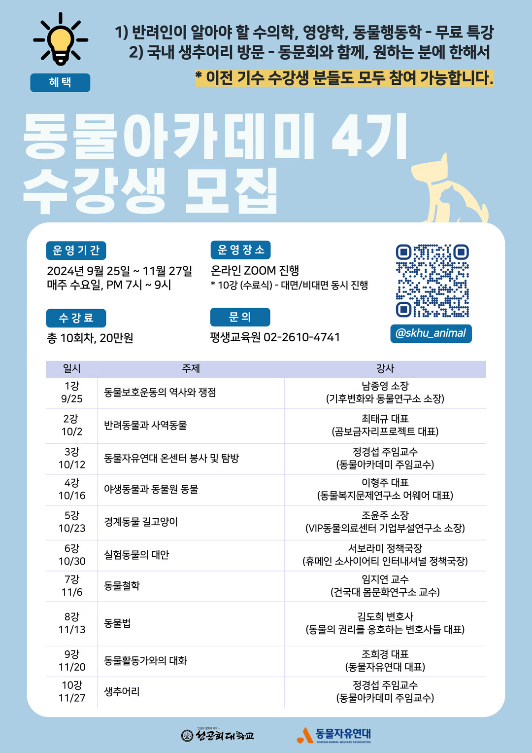 정경섭 동물아카데미 주임교수를 비롯해 남종영 기후변화와 동물보호소(가칭) 소장, 곰보금자리프로젝트 최태규 대표, 동물복지문제연구소 어웨어 이형주 대표, VIP동물의료센터 기업부설연구소 조윤주 소장, 휴메인 소사이어티 인터네셔널 서보라미 정책국장, 건국대학교 몸문화연구소 임지연 교수 등이 강사로 나선다.