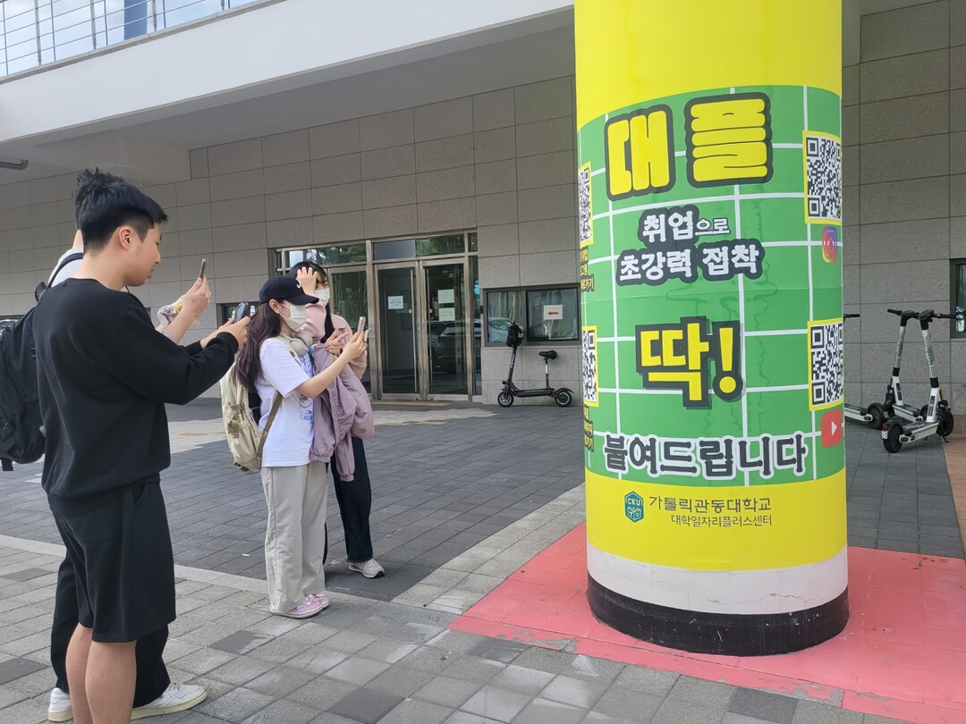 가톨릭관동대 대학일자리플러스센터는 최근 교내 세바스티아노 스포츠센터 원형 기둥에 ‘딱풀’ 형상을 한 홍보물을 게시했다.
