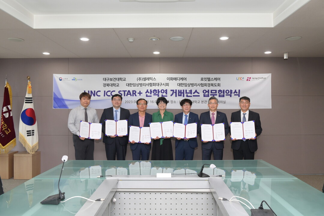 협약식에는 대구보건대와 셀레믹스, 이화메디케어, 로킷헬스케어, 대한임상병리사협회 대구시회·경북도회, 경북대학교 글로벌생명소재 ICC 등 헬스케어 분야 7개 기관 관계자들이 참석했다.